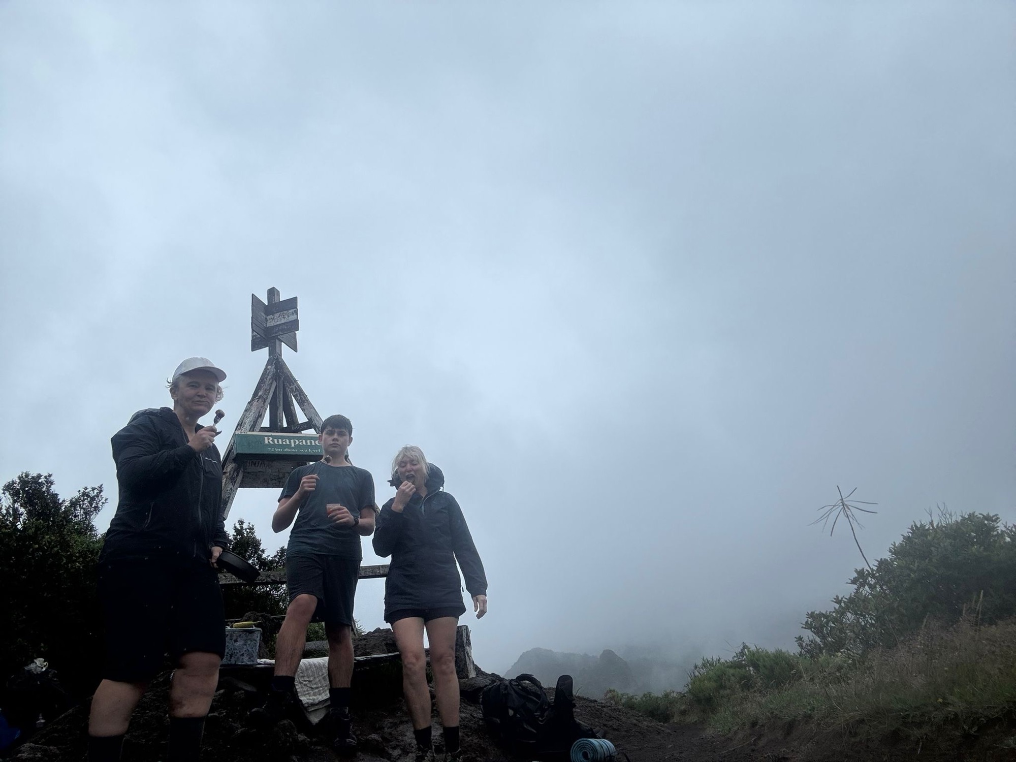 We arrive first. It is overcast and we can see the rain falling in the valley below. Nevertheless, it’s cooker and sausage time. While the sausages cook, I adorn my raincoat. Then Bilbo Baggins walks around the side of the mountain sodden in his good t-shirt he got for Christmas (I make note to talk about when to and when not to use good clothes), but instead of Frodo throwing his arms around him in palpable relief, it’s his mother. He too enjoys a hot sausage, with none of us worried about double dipping the tomato sauce when 700 metres up a mountain in light drizzle. The teenager wants to keep moving. And so off we head back down. We pass three other people on the track heading up to the trig, feeling a slight sense of relief we have company in arguable foolishness. Nevertheless, we quicken our pace in case the river is on the rise. There was no issue as we wade across the river and I can’t help but feel this is real tramping. We reach the car park shelter, where we strip off muddied and wet gear, finish our snacks and water. Today wasn’t make believe hiking. Today was tough, in a rewarding way, and well and truly gives me my wilderness fix.