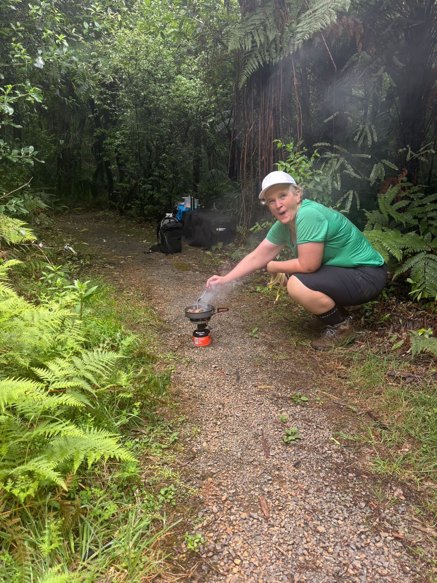 By now there is a phone call from the boy’s father. By chance this weekend the eldest, Harry on the eve of turning 15, is doing a solo hike elsewhere in the Pirongia Forest Park. His father’s wish. They had done a practice hike a few weeks before and this weekend was show time. The phone call goes along the lines of the Park is closed due to wash outs and impassable tracks. Everyone that was registered for an overnight stay is off the mountain or making their way off, other than solo, 15-year-old Harry. For once he’s not looking at his phone, father’s instructions and all. Oblivious, on Harry walks up and up and up. Rose and I decide against the longer walk to the tall tree. What’s a tall tree anyway and start to make our way back. There’s not a lot we can do about Harry. It’s no longer raining, hasn’t been since the overnight deluge. I assure Rose there will be a Doc Ranger in the hut at this time of year for such a popular track. We find out later, even the Ranger has been evacuated. While it’s not raining, it’s a bit bleak and not conducive to a nice sunny picnic spot and I start to accept my sausages will have to wait another day. But Rose insists, why wouldn’t we? It’s now my turn to channel my 8-year-old self and quickly set to getting the cooker going. We have our hot drink courtesy of the Thermos. Because this is make believe hiking, I carry a picnic blanket, something you’d never take proper hiking because of the weight. And of course, there is tomato sauce and salt and pepper. Even a paper towel each. Make believe hiking really does have a lot of pros in the pro column. We enjoy our hot lunch and of course scroggin. What’s hiking without chocolate, nuts and raisins?