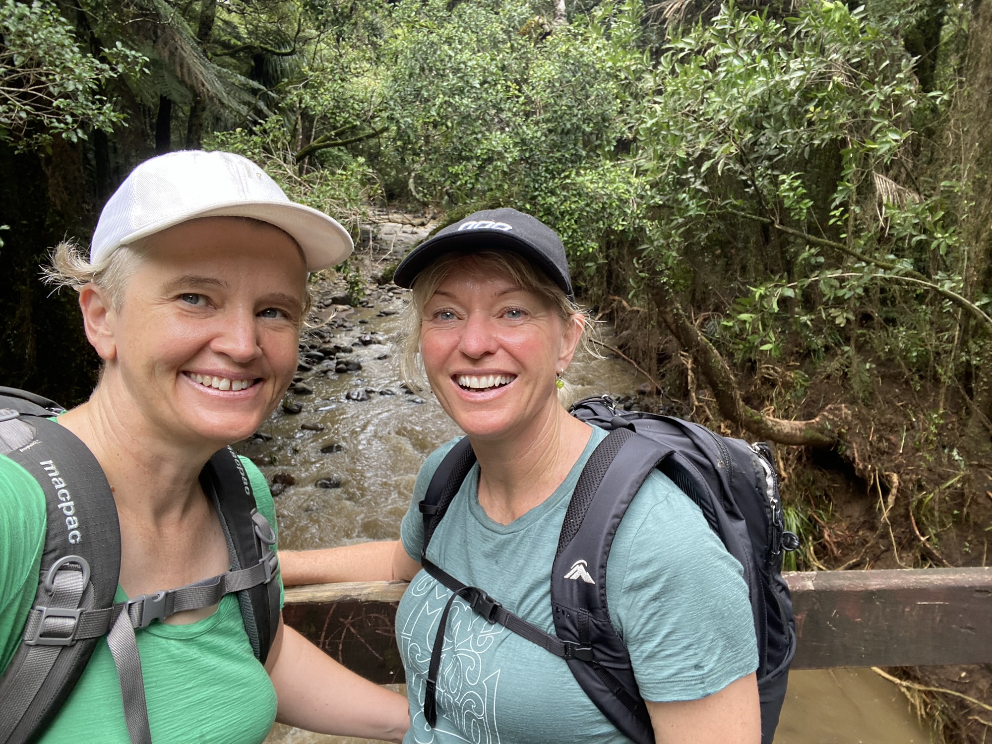 After a hearty cooked breakfast we set off for the second day of walking. We know this walk is more strenuous than the first. The climb is 723 metres to the Ruapene summit. All going well, Harry will meet us there and walk back down with us. The total walk, allowing sausage time, is five hours. We find the road to lead us to the carpark. Closed, the sign says. But the sign is only on one side of the road and looks like the cones have been moved. We look at each other with an unsaid question and answer. Off we set down the road. Without mishap we make the carpark, the only ones there. We set off on the highly recommended Mangakara Nature Loop, before joining the Ruapene track. Not far in yellow tape across the track suggests it is closed. We take it as a suggestion. The washed out bridge makes us scratch our heads. Clever cookies that we are, we think it’s a loop track so head the other way only to find a second washed out bridge. I’m starting to feel less clever but that doesn’t stop us from wading the safe looking river. With wet boots and socks we hit the Ruapene Track. And this is real hiking. The track is still formed, but with tree roots and rocks, it’s a tough climb up hill, the heart rate rising, the pack firmly on the back and we need to make sure we keep the orange track markers in site so we don’t get lost. Rose does verbalise her ponderings of what one would do if we had 20 seconds before a land slide hit. Her answer makes me wonder how long her 20 seconds is. I simply think perhaps we are not clever cookies but foolish ones with the headlines of the stupid middle-aged ladies that ignored all the danger signs. As yet we haven’t seen anyone engaging in such stupidity. Nevertheless, we solider on up and up. As we nearer the trig the track becomes big boulders we haul ourselves up. The fitness being tested with mini breaks required to capture breath before another assault up the rocks, the motivation of meeting Harry at the agreed time helping to fuel us.