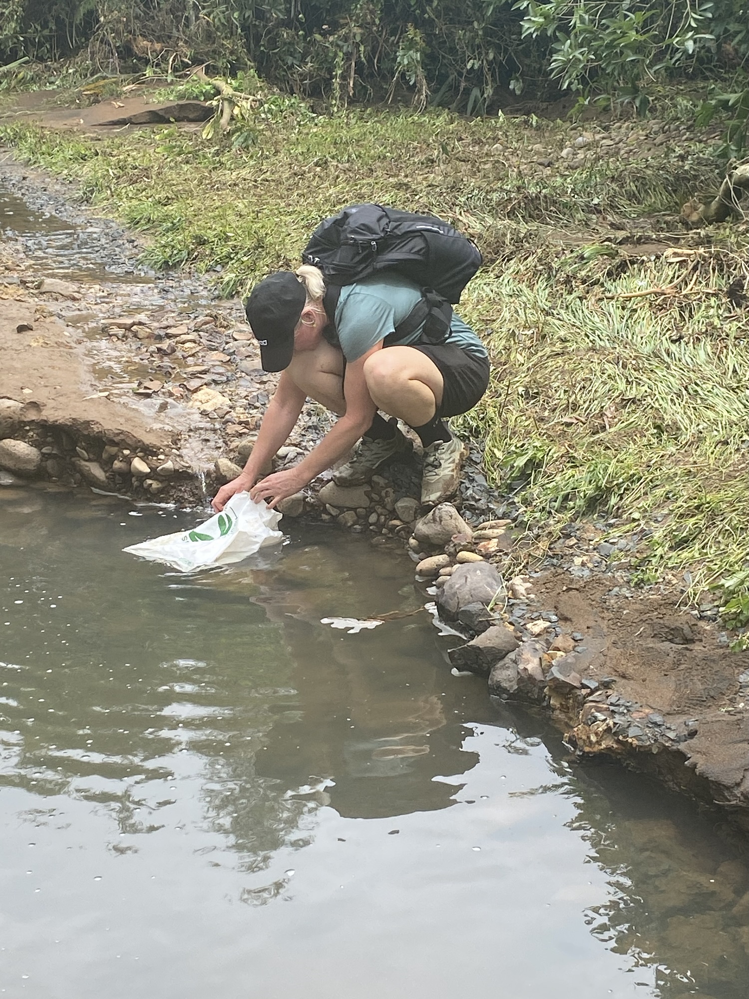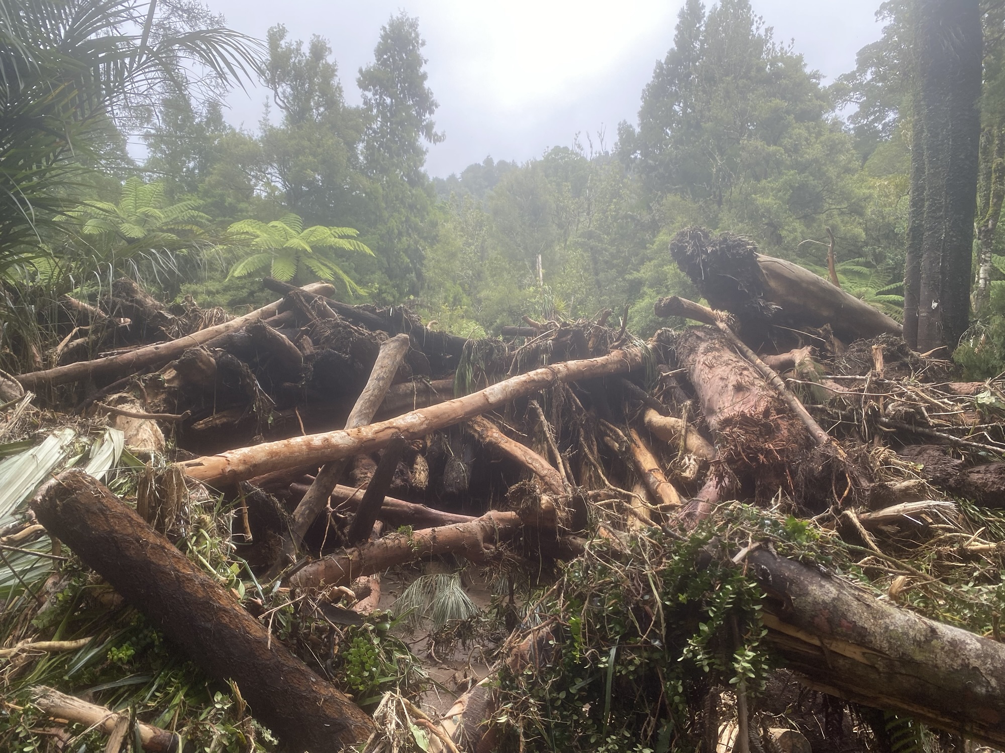 So, we set off on our walk starting on a gravel road beside the river, before it joins the Nikau Loop. The destruction is clear, with debris tangled in between the strong, tall standing trees beside the river. The other side, the maize crops in the paddock are partly mowed down by the strong currents of what must have been a temporary river. We wonder if this must be what a flash flood does. Parts of the road we walk are covered in silt. We scramble a few large trees that now lay horizontal. We come across a local, with a thick (we decide) Dutch accent. He’s lived in the area 35 years and does this walk every day and never seen anything like it. After enquiring about our intended route, he assures us our chosen tracks will be safe, so we carry on. Besides, Rose is now channelling her eight-year-old self saving creatures in distress. In this case the creatures are eels who are stranded in muddy puddles on the road. Some are unlucky. Some, Rose gives a little nudge to assess signs of life. A plastic bag that was providing an extra layer of water tightness for a sweatshirt now becomes a rescue tool. Our reasonably short walk to the Nikau Loop takes considerably longer as Eel Dundee wrangles the muddy, grey, wriggly things into the bag before a quick transport to the river for release. Nine in total are rescued. One is in such a muddy puddle I’m given the rescue device and asked to save this one, my proper tramping boots apparently more suitable than her trainers. I hate eels. As in, freak out, even as a write I can sense the physical shudder of my body at the mere thought of seeing one, let alone the ick of touching one. Quite odd given I grew up swimming in creeks and having the things take off beneath my feet. I try my best not to shriek in fear as I manage to capture the thing and quickly hand off to Rose who takes the glory of a safe delivery to the river.