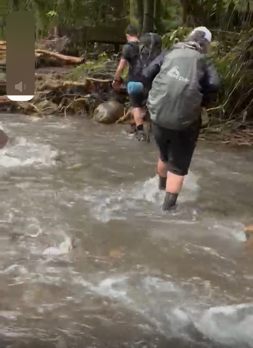 By walks end we are muddied, my boots covered from some of the ankle deep muddy surprises. By now, we have spoken to Harry. He is near the top and safe. I encourage him to stay in the hut not in the tent he carries. He takes no convincing at all.